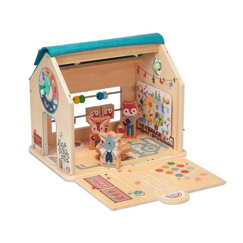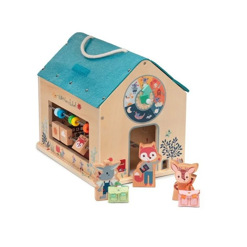 Le toit de l’école s’ouvre et dévoile alors une salle de classe pleine de surprises et de jeux à se raconter. Un emplacement est prévu pour le tableau où l’enfant pourra changer les notions étudiées (3 planches recto-verso). Un mini boulier ainsi que des formes à déplacer sont présents dans la classe tout comme une petite clochette sonnant la récréation. Une fois l’heure de la pause sonnée, un pan de mur peut se retirer et ainsi révéler la cour de récré. Joe et Stella peuvent alors poser leur cartable et leur carnet de liaison pour aller s’amuser et jouer à la marelle. Une multitude d’autres détails colorés sont à découvrir sur les pans de murs ou à l’intérieur de la classe. L’ensemble des pièces qui composent ce jouet peuvent être rangées à l’intérieur de Ma Première École Lilliputiens, et l’anse dont elle est pourvue permet de l’emmener partout, facilement.